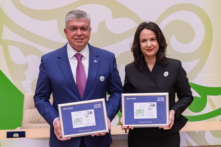 Градоначальник совместно с заместителем директора по коммерческой деятельности УФПС «Татарстан почтасы» АО «Почта России» Светланой Гришиной провели уникальную процедуру: поставили оттиски специального штемпеля на праздничные конверты.