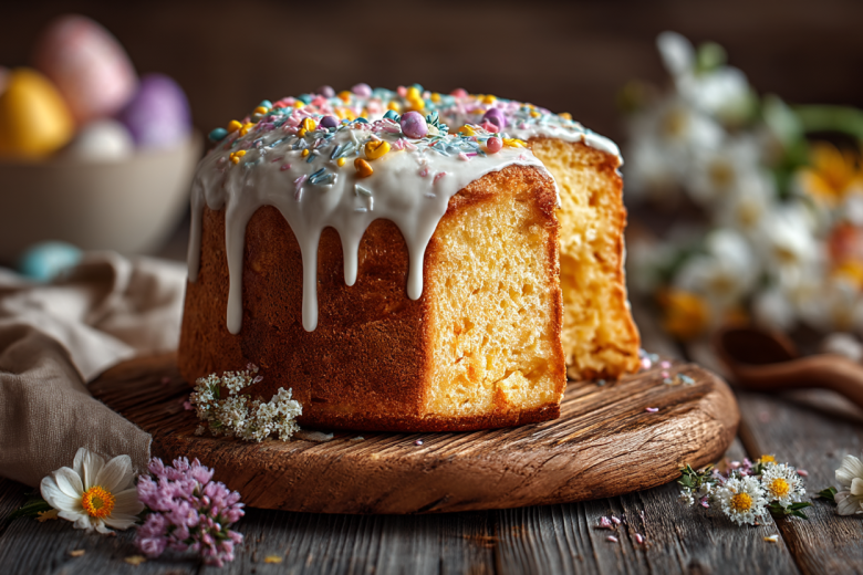 Для глазури смешиваю сахарную пудру с лимонным соком до густой, однородной массы. Покрываю остывший кулич глазурью, сразу посыпаю цветной посыпкой.