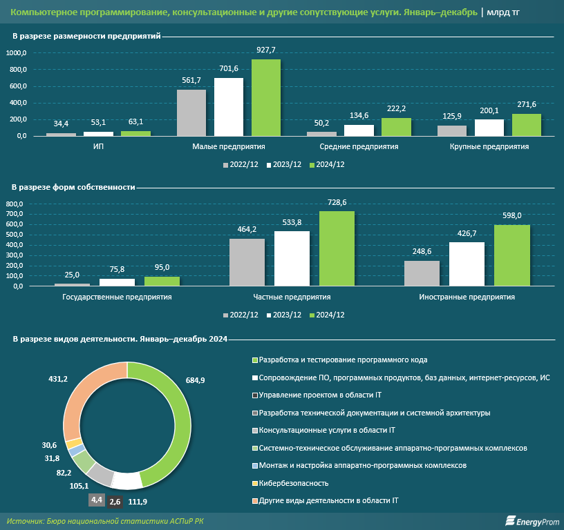 Подчеркивается, что наибольший объём IT-услуг обеспечили малые предприятия: 927,7 млрд тенге — на треть больше, чем в 2023 году. Крупные предприятия оказали услуг на 271,6 млрд тенге, средние — на 222,2 млрд тенге. При этом, отмечается, что объём услуг у крупных компаний вырос на 35,8%, а у средних — на 65,1%. Индивидуальные предприниматели обеспечили лишь 4,3% услуг в секторе — на 19% больше, чем годом ранее.