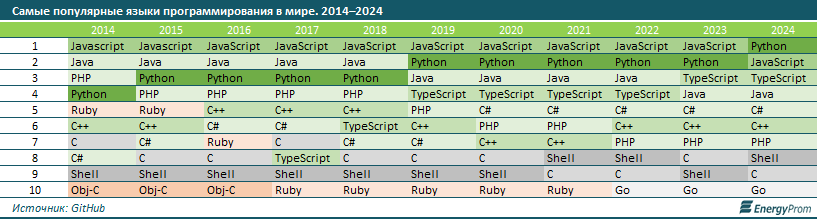 В 2024 году Python впервые превзошел по популярности JavaScript. Python, известный своим относительно простым и читаемым синтаксисом по сравнению с более традиционными языками вроде C или Java, широко используется в таких областях, как машинное обучение, наука о данных и научные вычисления", — заявили аналитики.
