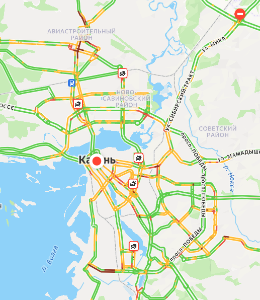 По данным сервиса «Яндекс карты», наиболее сильные заторы наблюдаются в центре на Ершова, на въезде в Салмачи, а также в Авиастроительном районе на улицах Академика Павлова и Максимова.